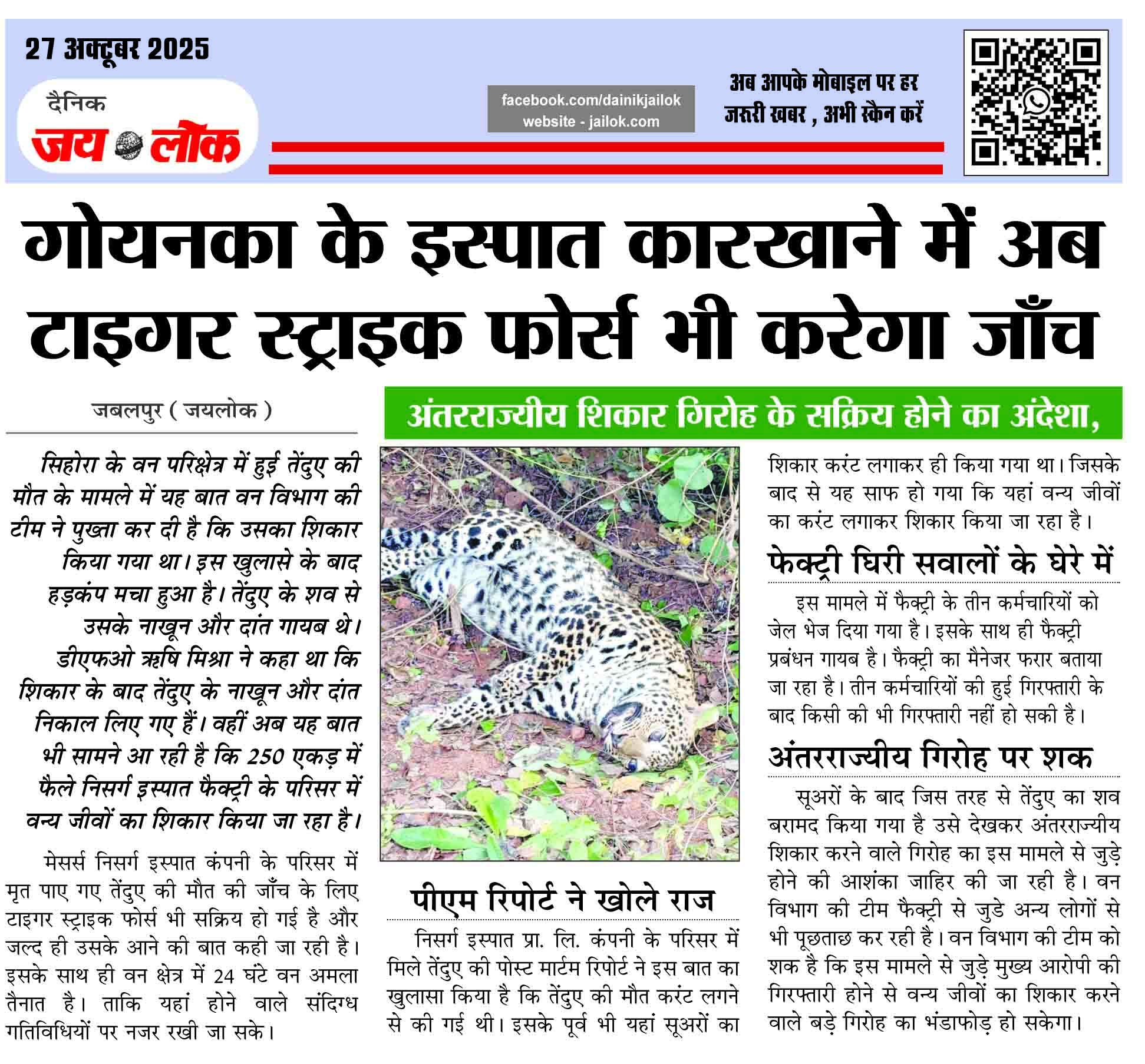 सिहोरा के वन परिक्षेत्र में हुई तेंदुए की मौत के मामले में यह बात वन विभाग की टीम ने पुख्ता कर दी है कि उसका शिकार किया गया था। इस खुलासे के बाद हडक़ंप मचा हुआ है। तेंदुए के शव से उसके नाखून और दांत गायब थे। डीएफओ ऋषि मिश्रा ने कहा था कि शिकार के बाद तेंदुए के नाखून और दंात निकाल लिए गए हैं। वहीं अब यह बात भी सामने आ रही है कि 250 एकड़ में फैले निसर्ग इस्पात फैक्ट्री के परिसर में वन्य जीवों का शिकार किया जा रहा है।