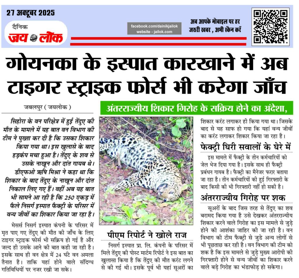 जबलपुर (जयलोक) सिहोरा के वन परिक्षेत्र में हुई तेंदुए की मौत के मामले में यह बात वन विभाग की टीम ने पुख्ता कर दी है कि उसका शिकार किया गया था। इस खुलासे के बाद हडक़ंप मचा हुआ है। तेंदुए के शव से उसके नाखून और दांत गायब थे। डीएफओ ऋषि मिश्रा ने कहा था … Continue reading गोयनका के इस्पात कारखाने में अब टाइगर स्ट्राइक फोर्स भी करेगा जाँच, अंतरराज्यीय शिकार गिरोह के सक्रिय होने का अंदेशा,