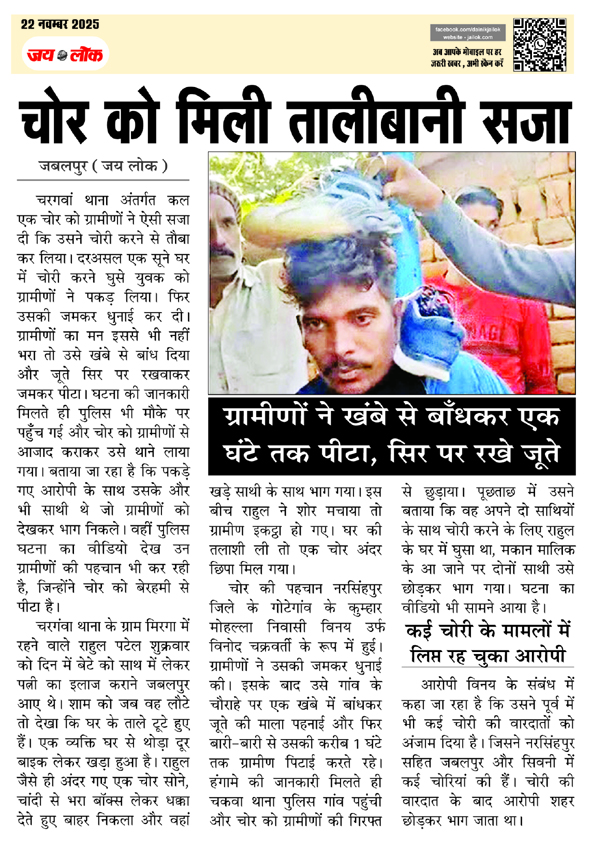 ग्रामीणों ने खंबे से बाँधकर एक घंटे तक पीटा, सिर पर रखे जूते जबलपुर (जय लोक)। चरगवां थाना अंतर्गत कल एक चोर को ग्रामीणों ने ऐसी सजा दी कि उसने चोरी करने से तौबा कर लिया। दरअसल एक सूने घर में चोरी करने घुसे युवक को ग्रामीणों ने पकड़ लिया। फिर उसकी जमकर धुनाई कर … Continue reading चोर को मिली तालीबानी सजा