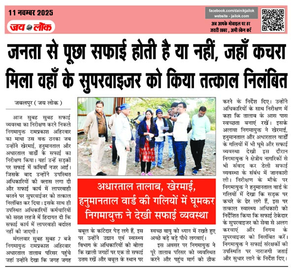 जबलपुर (जय लोक)। आज सुबह सुबह सफाई व्यवस्था का निरीक्षण करने निकले निगमायुक्त रामप्रकाश अहिरवार का माथा उस वक्त ठनका जब उन्होंने खेरमाई, हनुमानताल और अधारताल वार्डों के सफाई का निरीक्षण किया। यहां उन्हें सडक़ों पर सफाई में कमियाँ नजर आईं। जिसके बाद उन्होंने उपस्थित अधिकारियों की क्लास लगा दी और सफाई कार्य में लापरवाही बरतने पर सुपरवाईजर को तत्काल निलंबित कर दिया। इसके साथ ही उपस्थित अधिकारियों कर्मचारियों को सख्त लहजे में हिदायत दी कि सफाई कार्य में लापरवाही बर्दाश्त नहीं की जाएगी।