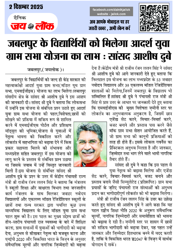 जबलपुर के विद्यार्थियों को मिलेगा आदर्श युवा ग्राम सभा योजना का लाभ : सांसद आशीष दुबे