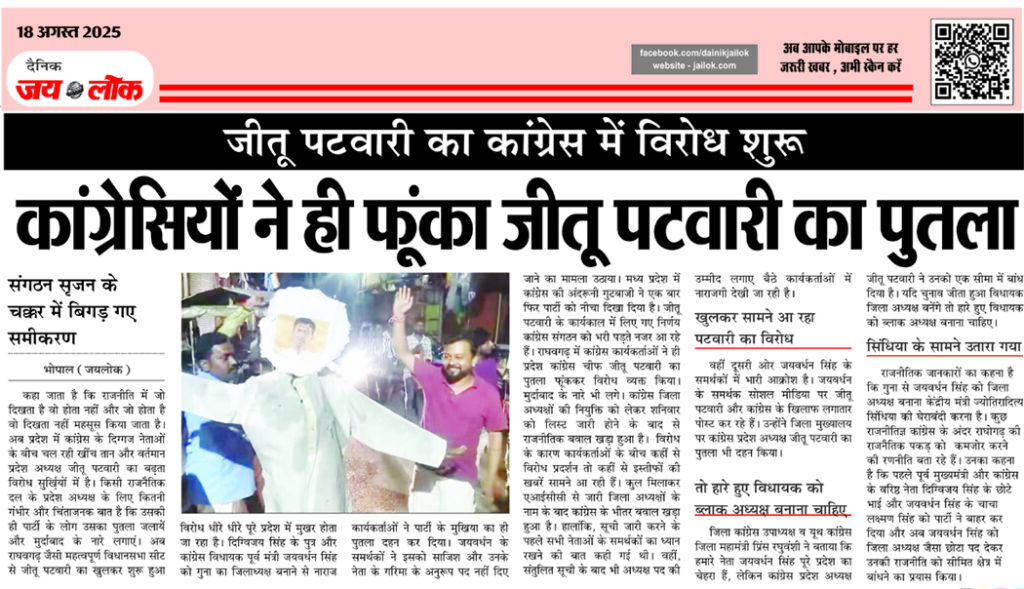 संगठन सृजन के चक्कर में बिगड़ गए समीकरण भोपाल (जयलोक)। कहा जाता है कि राजनीति में जो दिखता है वो होता नहीं और जो होता है वो दिखता नहीं महसूस किया जाता है। अब प्रदेश में कांग्रेस के दिग्गज नेताओं के बीच चल रही खींच तान और वर्तमान प्रदेश अध्यक्ष जीतू पटवारी का बढ़ता विरोध … Continue reading जीतू पटवारी का कांग्रेस में विरोध शुरू, कांग्रेसियों ने ही फूंका जीतू पटवारी का पुतला