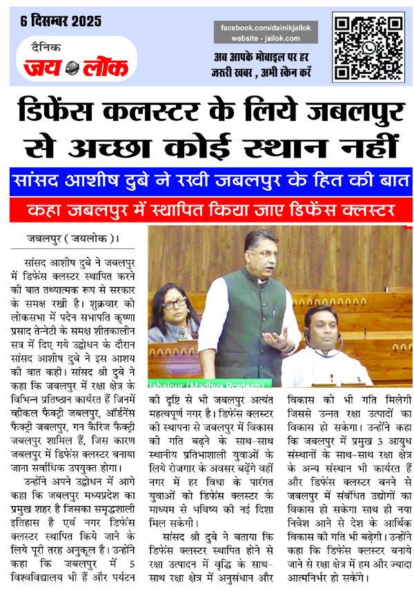 जबलपुर (जयलोक)। सांसद आशीष दुबे ने जबलपुर में डिफेंस क्लस्टर स्थापित करने की बात तथ्यात्मक रूप से सरकार के समक्ष रखी है। शुक्रवार को लोकसभा में पदेन सभापति कृष्णा प्रसाद तेन्नेटी के समक्ष शीतकालीन सत्र में दिए गये उद्बोधन के दौरान सांसद आशीष दुबे ने इस आशय की बात कही। सांसद श्री दुबे ने कहा … Continue reading डिफेंस कलस्टर के लिये जबलपुर से अच्छा कोई स्थान नहीं, सांसद आशीष दुबे ने रखी जबलपुर के हित की बात, कहा जबलपुर में स्थापित किया जाए डिफेंस क्लस्टर