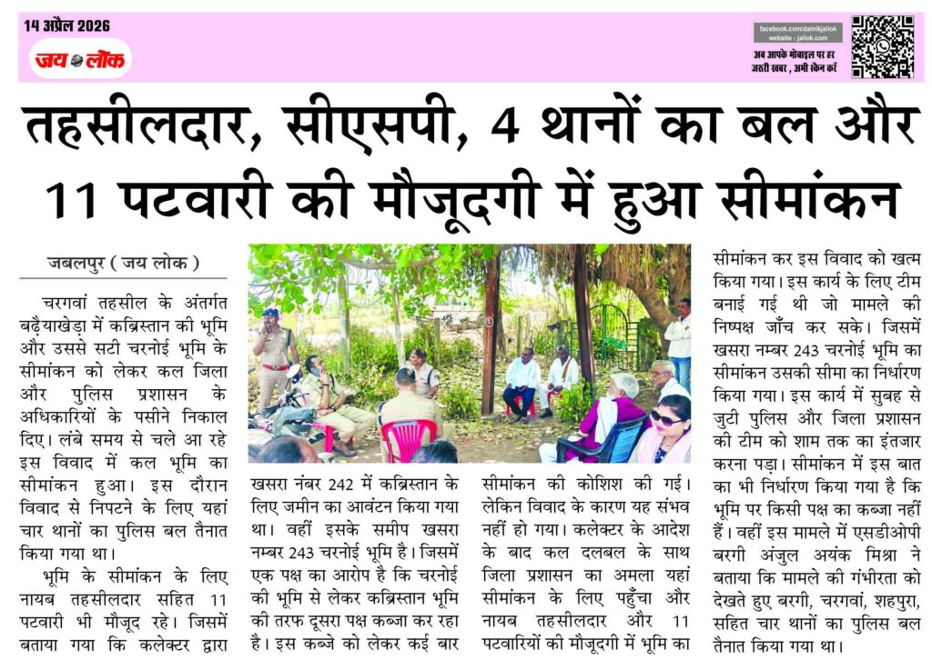 जबलपुर (जय लोक) । चरगवां तहसील के अंतर्गत बढ़ैयाखेड़ा में कब्रिस्तान की भूमि और उससे सटी चरनोई भूमि के सीमांकन को लेकर कल जिला और पुलिस प्रशासन के अधिकारियों के पसीने निकाल दिए। लंबे समय से चले आ रहे इस विवाद में कल भूमि का सीमांकन हुआ। इस दौरान विवाद से निपटने के लिए यहां … Continue reading तहसीलदार, सीएसपी, 4 थानों का बल और 11 पटवारी की मौजूदगी में हुआ सीमांकन
