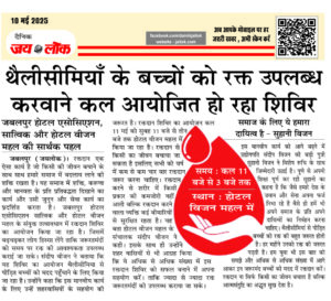 थैलीसीमियाँ के बच्चों को रक्त उपलब्ध करवाने कल होटल विजन महल में आयोजित हो रहा शिविर