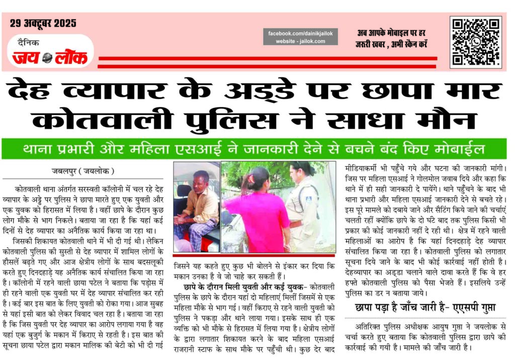 जबलपुर (जयलोक)। कोतवाली थाना अंतर्गत सरस्वती कॉलोनी में चल रहे देह व्यापार के अड्डे पर पुलिस ने छापा मारते हुए एक युवती और एक युवक को हिरासत में लिया है। वहीं छापे के दौरान कुछ लोग मौके से भाग निकले। बताया जा रहा है कि यहां कई दिनों से देह व्यापार का अनैतिक कार्य किया … Continue reading देह व्यापार के अड्डे पर छापा मार कोतवाली पुलिस ने साधा मौन, थाना प्रभारी और महिला एसआई ने जानकारी देने से बचने बंद किए मोबाईल