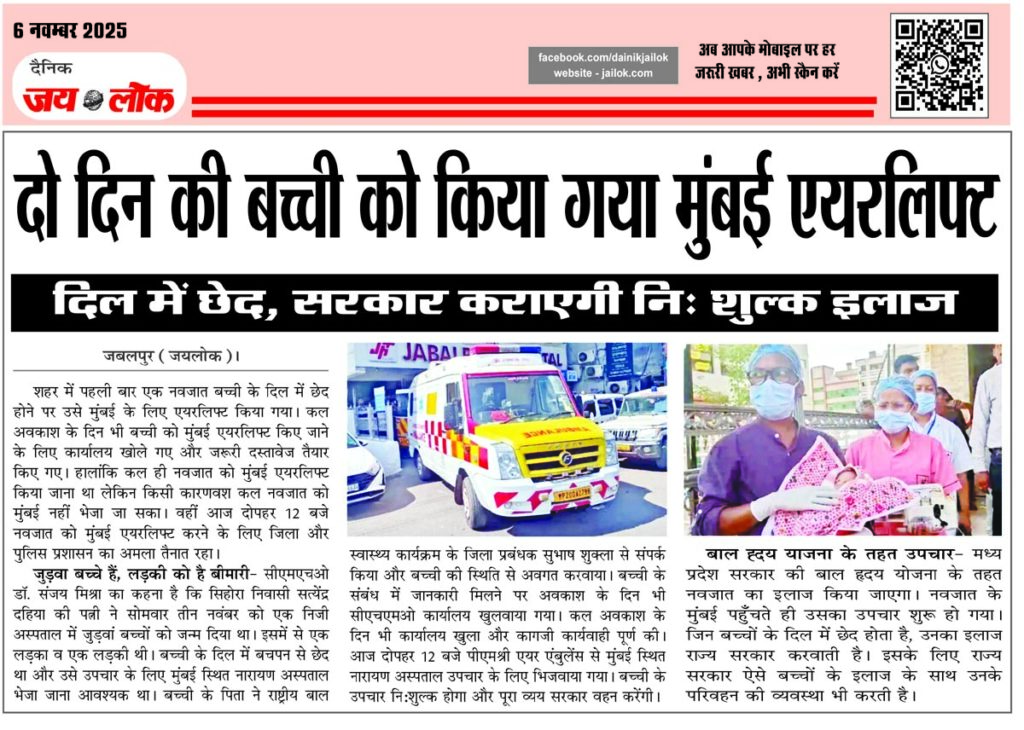 जबलपुर (जयलोक)। शहर में पहली बार एक नवजात बच्ची के दिल में छेद होने पर उसे मुंबई के लिए एयरलिफ्ट किया गया। कल अवकाश के दिन भी बच्ची को मुंबई एयरलिफ्ट किए जाने के लिए कार्यालय खोले गए और जरूरी दस्तावेज तैयार किए गए। हालांकि कल ही नवजात को मुंबई एयरलिफ्ट किया जाना था लेकिन … Continue reading दो दिन की बच्ची को किया गया मुंबई एयरलिफ्ट, दिल में छेद, सरकार कराएगी नि: शुल्क इलाज