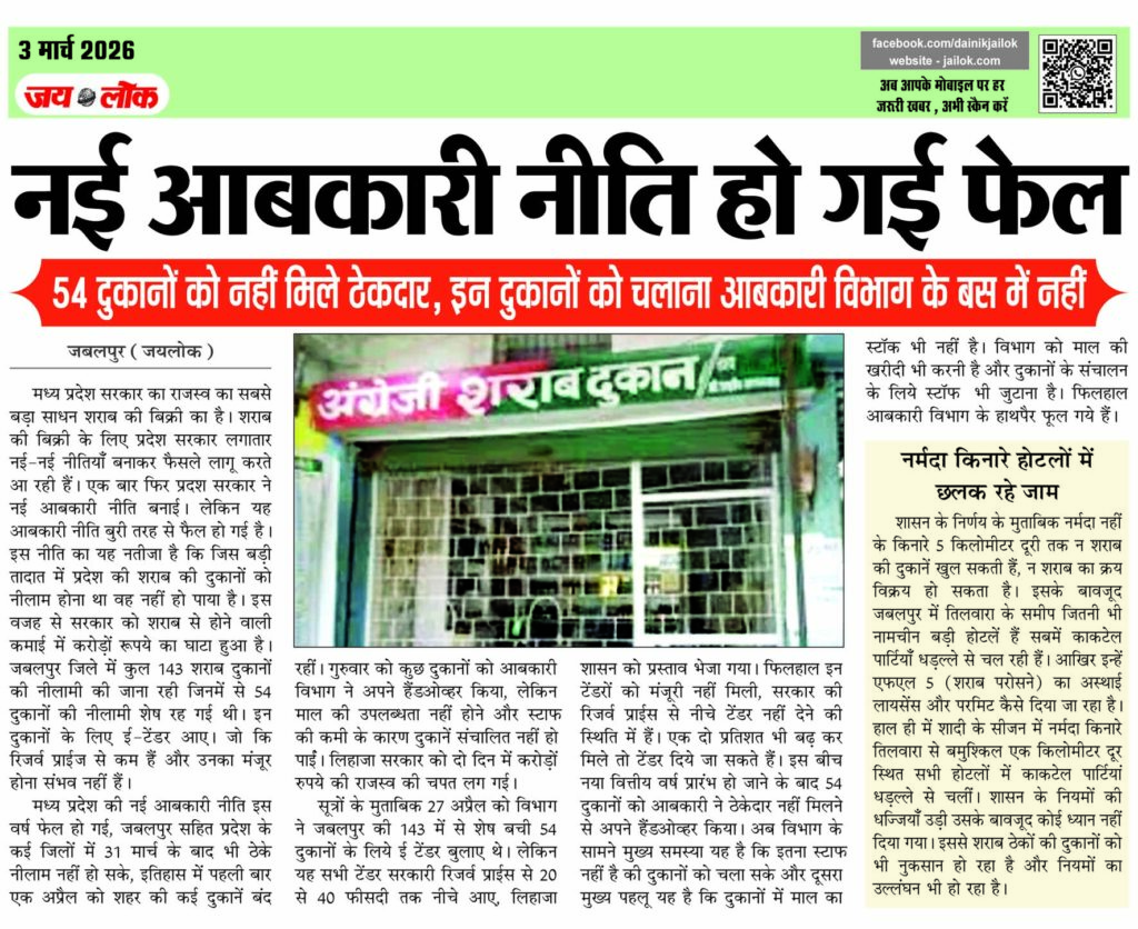 54 दुकानों को नहीं मिले ठेकदार, इन दुकानों को चलाना आबकारी विभाग के बस में नहीं जबलपुर (जयलोक)। मध्य प्रदेश सरकार का राजस्व का सबसे बड़ा साधन शराब की बिक्री का है। शराब की बिक्री के लिए प्रदेश सरकार लगातार नई-नई नीतियाँ बनाकर फैसले लागू करते आ रही हैं। एक बार फिर प्रदश सरकार ने … Continue reading नई आबकारी नीति हो गई फेल