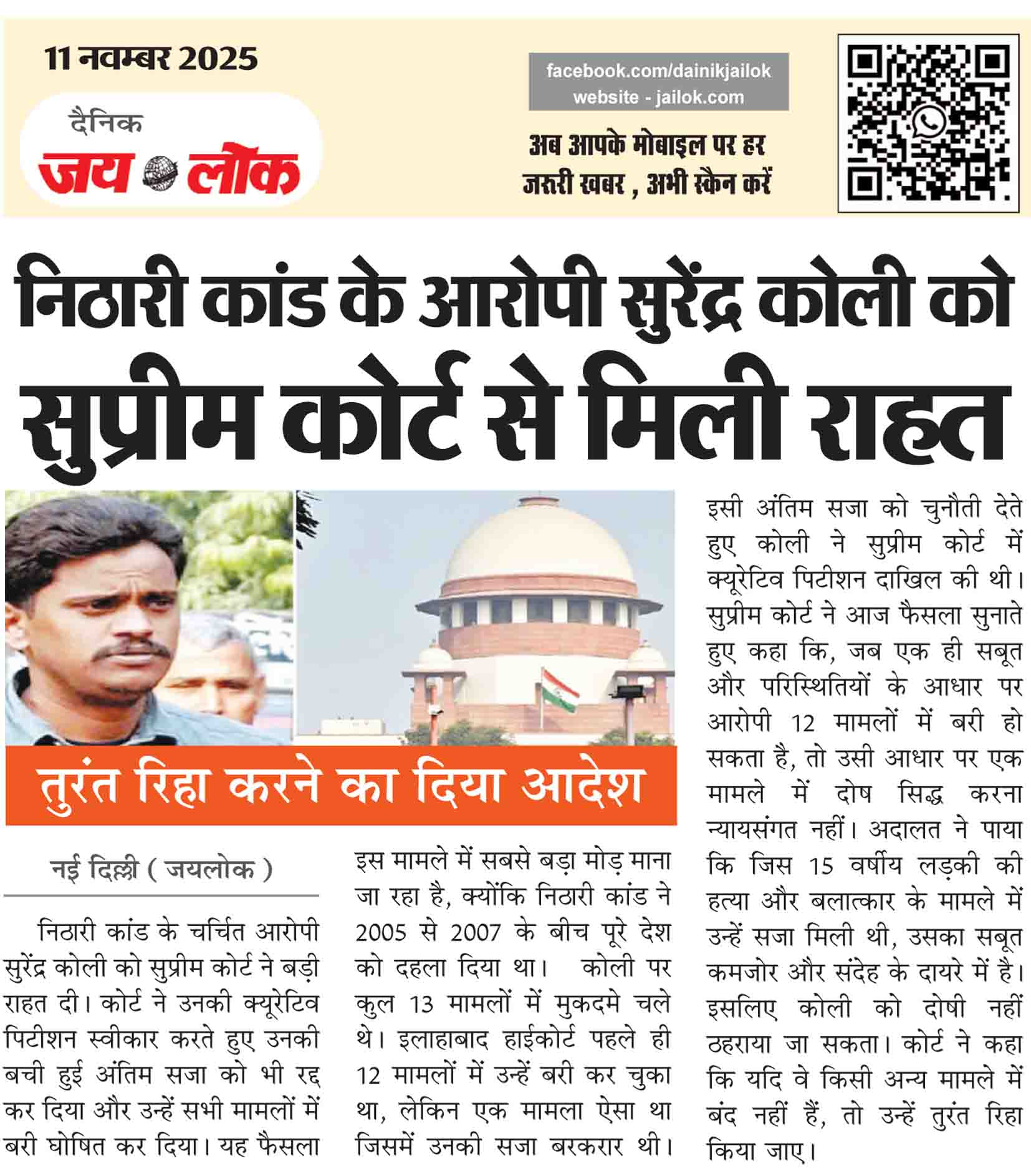 नई दिल्ली (जयलोक)। निठारी कांड के चर्चित आरोपी सुरेंद्र कोली को सुप्रीम कोर्ट ने बड़ी राहत दी। कोर्ट ने उनकी क्यूरेटिव पिटीशन स्वीकार करते हुए उनकी बची हुई अंतिम सजा को भी रद्द कर दिया और उन्हें सभी मामलों में बरी घोषित कर दिया। यह फैसला इस मामले में सबसे बड़ा मोड़ माना जा रहा … Continue reading निठारी कांड के आरोपी सुरेंद्र कोली को सुप्रीम कोर्ट से मिली राहत, तुरंत रिहा करने का दिया आदेश
