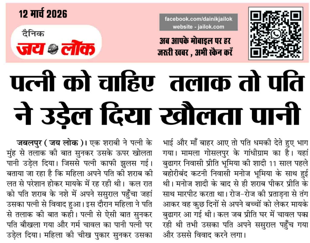 जबलपुर (जय लोक)। एक शराबी ने पत्नी के मुंह से तलाक की बात सुनकर उसके ऊपर खोलता पानी उड़ेल दिया। जिससे पत्नी काफी झुलस गई। बताया जा रहा है कि महिला अपने पति की शराब की लत से परेशान होकर मायके में रह रही थी। कल रात को पति शराब के नशे में अपने ससुराल … Continue reading पत्नी को चाहिए तलाक तो पति ने उड़ेल दिया खौलता पानी