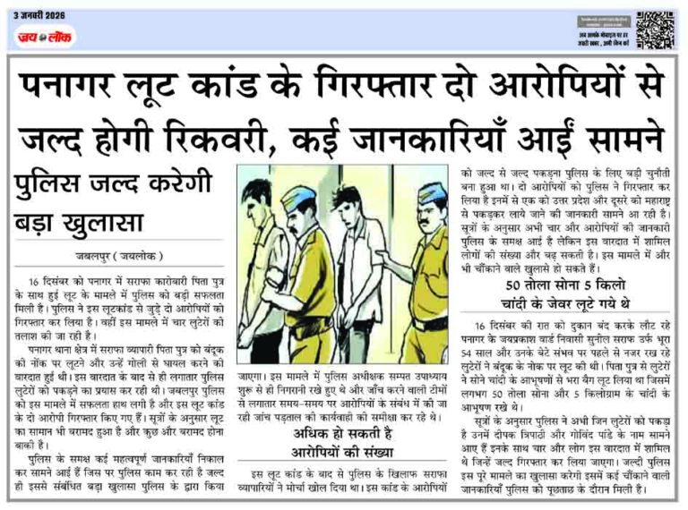 जबलपुर (जयलोक)। 16 दिसंबर को पनागर में सराफा कारोबारी पिता पुत्र के साथ हुई लूट के मामले में पुलिस को बड़ी सफलता मिली है। पुलिस ने इस लूटकांड से जुड़े दो आरोपियों को गिरफ्तार कर लिया है। वहीं इस मामले में चार लुटेरों की तलाश की जा रही है। पनागर थाना क्षेत्र में सराफा व्यापारी … Continue reading पनागर लूट कांड के गिरफ्तार दो आरोपियों से जल्द होगी रिकवरी, कई जानकारियाँ आईं सामने, पुलिस जल्द करेगी बड़ा खुलासा