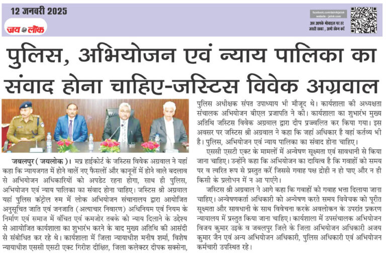 जबलपुर (जयलोक)। मप्र हाईकोर्ट के जस्टिस विवेक अग्रवाल ने यहां कहा कि न्यायजगत में होने वालें नए फैसलों और कानूनों में होने वाले बदलाव से अभियोजन अधिकारियों को अपडेट रहना होगा, साथ ही पुलिस, अभियोजन एवं न्याय पालिका का संवाद होना चाहिए। जस्टिस श्री अग्रवाल यहां पुलिस कंट्रोल रुम में लोक अभियोजन संचानालय द्वारा आयोजित … Continue reading पुलिस, अभियोजन एवं न्याय पालिका का संवाद होना चाहिए-जस्टिस विवेक अग्रवाल