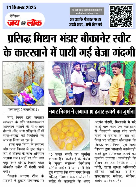 जबलपुर (जयलोक)। नगर निगम द्वारा लगातार स्वच्छता के प्रति जनजागरूकता अभियान चलाने के साथ-साथ होटलों और अन्य प्रतिष्ठानों में भी साफ-सफाई की स्थितियों का जायजा लिया जा रहा है। आज नगर निगम के स्वास्थ्य और खाद्य विभाग के द्वारा संयुक्त रूप से होटलों के जाँच अभियान चलाया गया। जहॉं पर गंगा नगर गढ़ा स्थित प्रसिद्ध … Continue reading प्रसिद्ध मिष्ठान भंडार बीकानेर स्वीट के कारखाने में पायी गई बेजा गंदगी नगर निगम ने लगाया 10 हजार रूपये का जुर्माना
