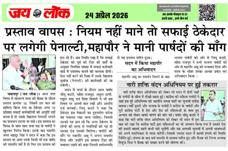 जबलपुर (जय लोक)। आज नगर निगम में साधारण सभा की बैठक के दौरान प्रस्ताव क्रमांक 18. जिसमें इस बात को शामिल किया गया था ठेकेदार अगर 70 प्रतिशत सफाई कर्मचारियों की आपूर्ति नहीं करता है तो उसके खिलाफ पेनाल्टी लगाने का प्रावधान हटाया जा सके। इस प्रस्ताव का विपक्ष के साथ साथ सत्ता पक्ष के … Continue reading प्रस्ताव वापस : नियम नहीं माने तो सफाई ठेकेदार पर लगेगी पेनाल्टी,महापौर ने मानी पार्षदों की माँग