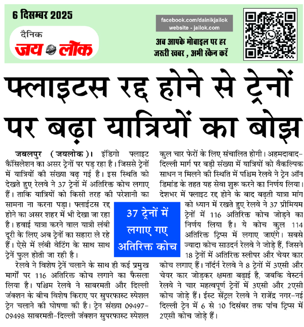 जबलपुर (जयलोक)। इंडिगो फ्लाइट कैंसिलेशन का असर ट्रेनों पर पड़ रहा है। जिससे ट्रेनों में यात्रियों की संख्या बढ़ गई है। इस स्थिति को देखते हुए रेलवे ने 37 ट्रेनों में अतिरिक्त कोच लगाए हैं। ताकि यात्रियों को किसी तरह की परेशानी का सामना ना करना पड़ा। फ्लाईटस रद्द होने का असर शहर में भी … Continue reading फ्लाइटस रद्द होने से ट्रेनों पर बढ़ा यात्रियों का बोझ, 37 ट्रेनों में लगाए गए अतिरिक्त कोच