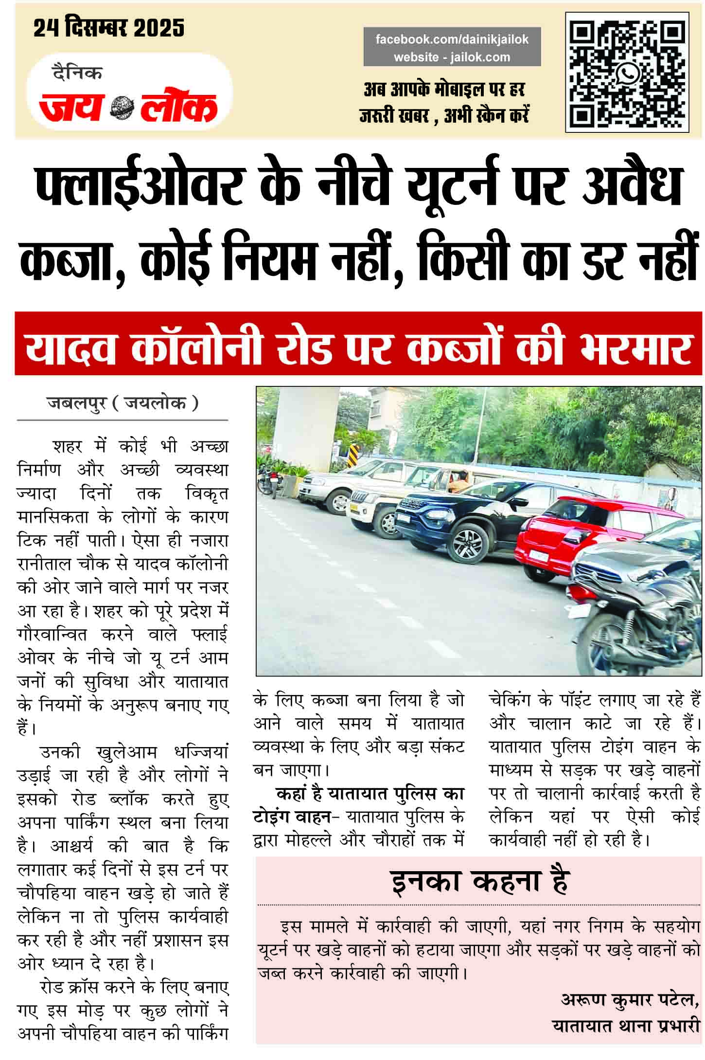 जबलपुर (जयलोक)। शहर में कोई भी अच्छा निर्माण और अच्छी व्यवस्था ज्यादा दिनों तक विकृत मानसिकता के लोगों के कारण टिक नहीं पाती। ऐसा ही नजारा रानीताल चौक से यादव कॉलोनी की ओर जाने वाले मार्ग पर नजर आ रहा है। शहर को पूरे प्रदेश में गौरवान्वित करने वाले फ्लाई ओवर के नीचे जो यू टर्न … Continue reading फ्लाईओवर के नीचे यूटर्न पर अवैध कब्जा, कोई नियम नहीं, किसी का डर नहीं, यादव कॉलोनी रोड पर कब्जों की भरमार