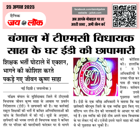 नई दिल्ली (जयलोक)। पश्चिम बंगाल के मुर्शिदाबाद जिले में टीएमसी विधायक जीवन कृष्ण साहा के आवास पर प्रवर्तन निदेशालय (ईडी) ने छापामारी की है।
