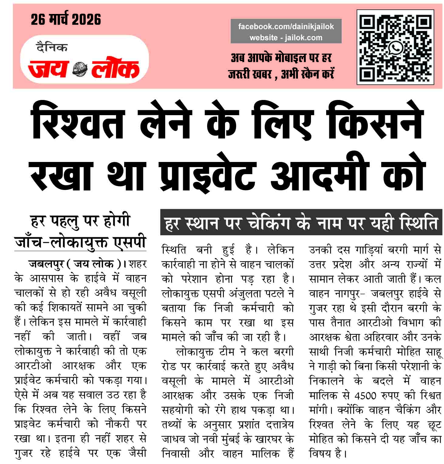 जबलपुर (जय लोक)। शहर के आसपास के हाईवे में वाहन चालकों से हो रही अवैध वसूली की कई शिकायतें सामने