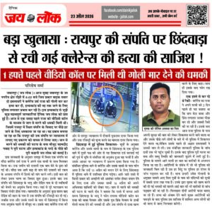 परितोष वर्मा जबलपुर (जय लोक)। आज सुबह जबलपुर के उप नगरीय क्षेत्र राँझी में 8:00 बजे जिस प्रकार बाइक सवार दो हमलावरों ने क्लेरेंस उर्फ राजा की गोली मार कर हत्या कर दी, हत्याकांड की तह तक जाने के लिए पुलिस लगातार प्रयास कर रही है। इस हत्याकांड से जुड़ी कुछ महत्वपूर्ण जानकारियां दैनिक जय … Continue reading बड़ा खुलासा : रायपुर की संपत्ति पर छिंदवाड़ा से रची गई क्लेरेन्स की हत्या की साजिश !, 1 हफ्ते पहले वीडियो कॉल पर मिली थी गोली मार देने की धमकी