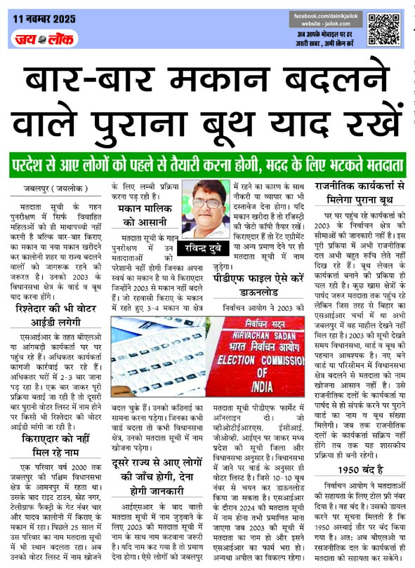 जबलपुर (जयलोक)। मतदाता सूची के गहन पुनरीक्षण में सिर्फ  विवाहित महिलओं को ही माथापच्ची नहीं करनी है बल्कि बार-बार किराए का मकान या नया मकान खरीदने कर कालोनी शहर या राज्य बदलने वालों को जागरूक रहने की जरूरत है। उनको 2003 के विधानसभा क्षेत्र के वार्ड व बूथ याद करना होंगे।