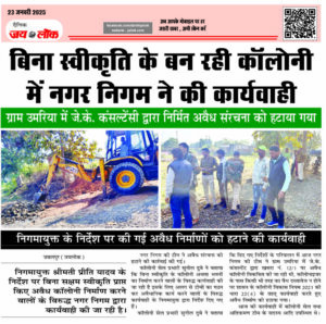 निगमायुक्त के निर्देश पर की गई अवैध निर्माणों को हटाने की कार्यवाही जबलपुर (जयलोक)। निगमायुक्त श्रीमती प्रीति यादव के निर्देश पर बिना सक्षम स्वीकृति प्राप्त किए अवैध कॉलोनी निर्माण करने वालों के विरुद्ध नगर निगम द्वारा कार्यवाही की जा रही है। नगर निगम की टीम ने अवैध संरचना को हटाने की कार्रवाई की गई।कॉलोनी सेल … Continue reading बिना स्वीकृति के बन रही कॉलोनी में नगर निगम ने की कार्यवाही, ग्राम उमरिया में जे.के. कंसल्टेंसी द्वारा निर्मित अवैध संरचना को हटाया गया