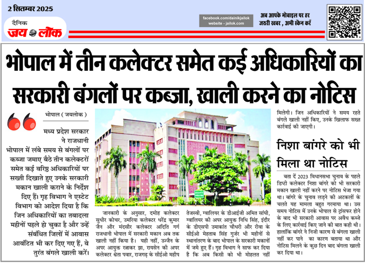 भोपाल (जयलोक)। मध्य प्रदेश सरकार ने राजधानी भोपाल में लंबे समय से बंगलों पर कब्जा जमाए बैठे तीन कलेक्टरों समेत कई वरिष्ठ अधिकारियों पर सख्ती दिखाते हुए उनके सरकारी मकान खाली कराने के निर्देश दिए हैं। गृह विभाग ने एस्टेट विभाग को आदेश दिया है कि जिन अधिकारियों का तबादला महीनों पहले हो चुका है और उन्हें संबंधित जिलों में आवास आवंटित भी कर दिए गए हैं, वे तुरंत बंगले खाली करें। जानकारी के अनुसार, दमोह कलेक्टर सुधीर कोचर, उमरिया कलेक्टर धरेंद्र कुमार जैन और मंदसौर कलेक्टर अदिति गर्ग राजधानी भोपाल में सरकारी मकान अब तक खाली नहीं किया है। यही नहीं, उज्जैन के अपर आयुक्त रत्नाकर झा, रायसेन की अपर कलेक्टर श्वेता पवार, राजगढ़ के सीईओ महीप तेजस्वी, ग्वालियर के डीआईजी अमित सांघी, ग्वालियर की अपर आयुक्त निधि सिंह, इंदौर के डीएसपी उमाकांत चौधरी और रीवा के सीईओ मेहताब सिंह गुर्जर भी महीनों से स्थानांतरण के बाद भोपाल के सरकारी मकानों में जमे हुए हैं। गृह विभाग ने साफ कर दिया है कि अब किसी को भी मोहलत नहीं मिलेगी। जिन अधिकारियों ने समय रहते बंगले खाली नहीं किए, उनके खिलाफ सख्त कार्रवाई की जाएगी।