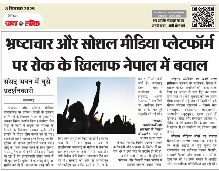 काठमांडू । भ्रष्टाचार और सोशल मीडिया प्लेटफॉर्म्स पर प्रतिबंध लगाने के सरकार के फैसले के खिलाफ नेपाल में युवाओं ने जमकर विरोध प्रदर्शन किया। जेनरेशन जेड पीढ़ी के लोगों ने सडक़ों पर सरकार के फैसले के खिलाफ आवाज बुलंद की। प्रदर्शन के दौरान लोग काफी उग्र हो गए। देखते ही देखते हालात इतने बिगड़ गए … Continue reading भ्रष्टाचार और सोशल मीडिया प्लेटफॉर्म पर रोक के खिलाफ नेपाल में बवाल, संसद भवन में घुसे प्रदर्शनकारी