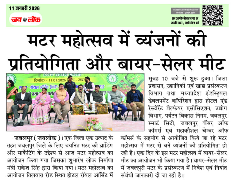जबलपुर (जयलोक)। एक जिला एक उत्पाद के तहत जबलपुर जिले के लिए चयनित मटर की ब्रांडिंग और मार्केटिंग के उद्देश्य से आज मटर महोत्सव का आयोजन किया गया जिसका शुभारंभ लोक निर्माणा मंत्री राकेश सिंह द्वारा किया गया। मटर महोत्सव का आयोजन तिलवारा रोड स्थित होटल रॉयल ऑर्बिट में सुबह 10 बजे से शुरू हुआ। … Continue reading मटर महोत्सव में व्यंजनों की प्रतियोगिता और बायर-सेलर मीट