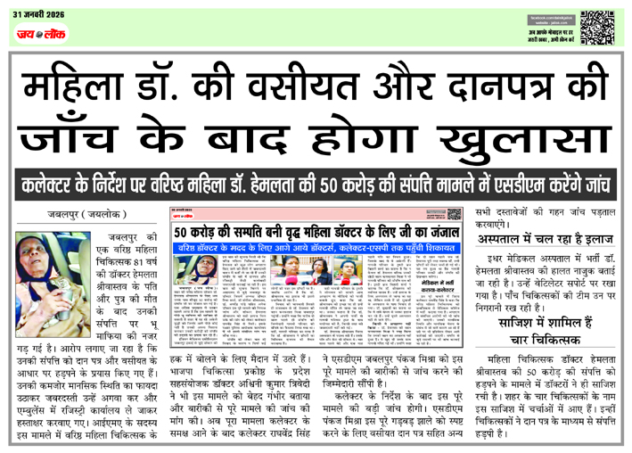 महिला चिकित्सक डॉक्टर हेमलता श्रीवास्तव की 50 करोड़ की संपत्ति को हड़पने के मामले में डॉक्टरों ने ही साजिश रची है। शहर के चार चिकित्सकों के नाम इस साजिश में चर्चाओं में आए हैं। इन्हीं चिकित्सकों ने दान पत्र के माध्यम से संपत्ति हड़पी है।