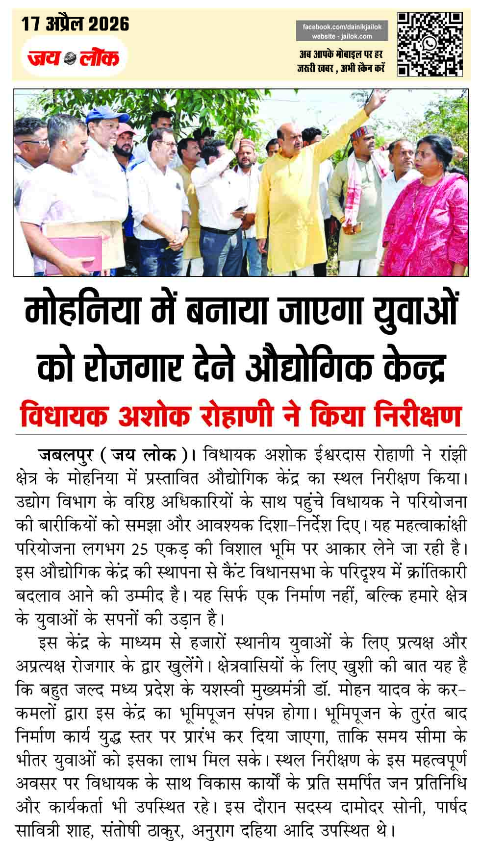 विधायक अशोक रोहाणी ने किया निरीक्षण जबलपुर (जय लोक)। विधायक अशोक ईश्वरदास रोहाणी ने रांझी क्षेत्र के मोहनिया में प्रस्तावित औद्योगिक केंद्र का स्थल निरीक्षण किया। उद्योग विभाग के वरिष्ठ अधिकारियों के साथ पहुंचे विधायक ने परियोजना की बारीकियों को समझा और आवश्यक दिशा-निर्देश दिए। यह महत्वाकांक्षी परियोजना लगभग 25 एकड़ की विशाल भूमि पर … Continue reading मोहनिया में बनाया जाएगा युवाओं को रोजगार देने औद्योगिक केन्द्र- रोहाणी