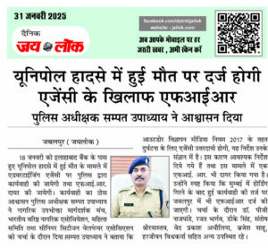 पुलिस अधीक्षक सम्पत उपाध्याय ने आश्वासन दिया जबलपुर (जयलोक)। 18 जनवरी को इलाहाबाद बैंक के पास हुए यूनिपोल हादसे में हुई मौत के मामले में एडवरटाईजिंग एजेंसी पर पुलिस द्वारा कार्यवाही की जायेगी तथा एफ.आई.आर. दायर की जायेगी। कार्यवाही का ठोस आश्वासन पुलिस अधीक्षक सम्पत उपाध्याय ने नागरिक उपभोक्ता मार्गदर्शक मंच, भारतीय वरिष्ठ नागरिक एसोसियेशन, … Continue reading यूनिपोल हादसे में हुई मौत पर दर्ज होगी एजेंसी के खिलाफ एफआईआर