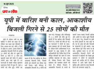 लखनऊ। यूपी में भीषण गर्मी के बाद बारिश ने लोगों को राहत दी है, लेकिन यह राहत कई परिवारों के लिए आफत बन गई। बीते 2 दिनों में प्रदेश के अलग-अलग जिलों में आकाशीय बिजली गिरने से करीब 25 लोगों की मौत हो चुकी है। सिर्फ 24 घंटों में 12 लोग इस कुदरती कहर की … Continue reading यूपी में बारिश बनी काल, आकाशीय बिजली गिरने से 25 लोगों की मौत