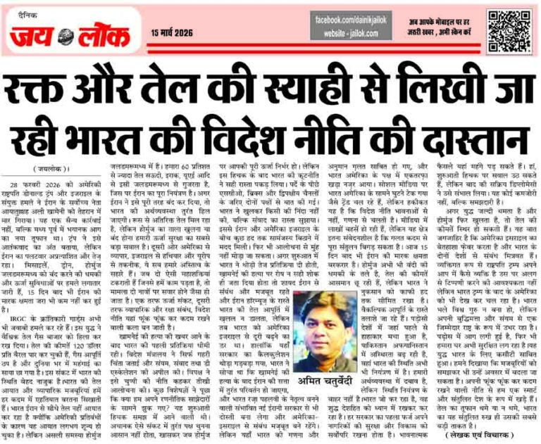 अमित चतुर्वेदी (जयलोक)। 28 फरवरी 2026 को अमेरिकी राष्ट्रपति डोनाल्ड ट्रंप और इजराइल के संयुक्त हमले ने ईरान के सर्वोच्च नेता आयातुल्लाह अली खामेनी को तेहरान में मार गिराया। यह एक सैन्य कार्रवाई नहीं, बल्कि मध्य पूर्व में भयानक आग का नया तूफान था। ट्रंप ने इसे आतंकवाद का अंत बताया, लेकिन ईरान का पलटवार … Continue reading रक्त और तेल की स्याही से लिखी जा रही भारत की विदेश नीति की दास्तान
