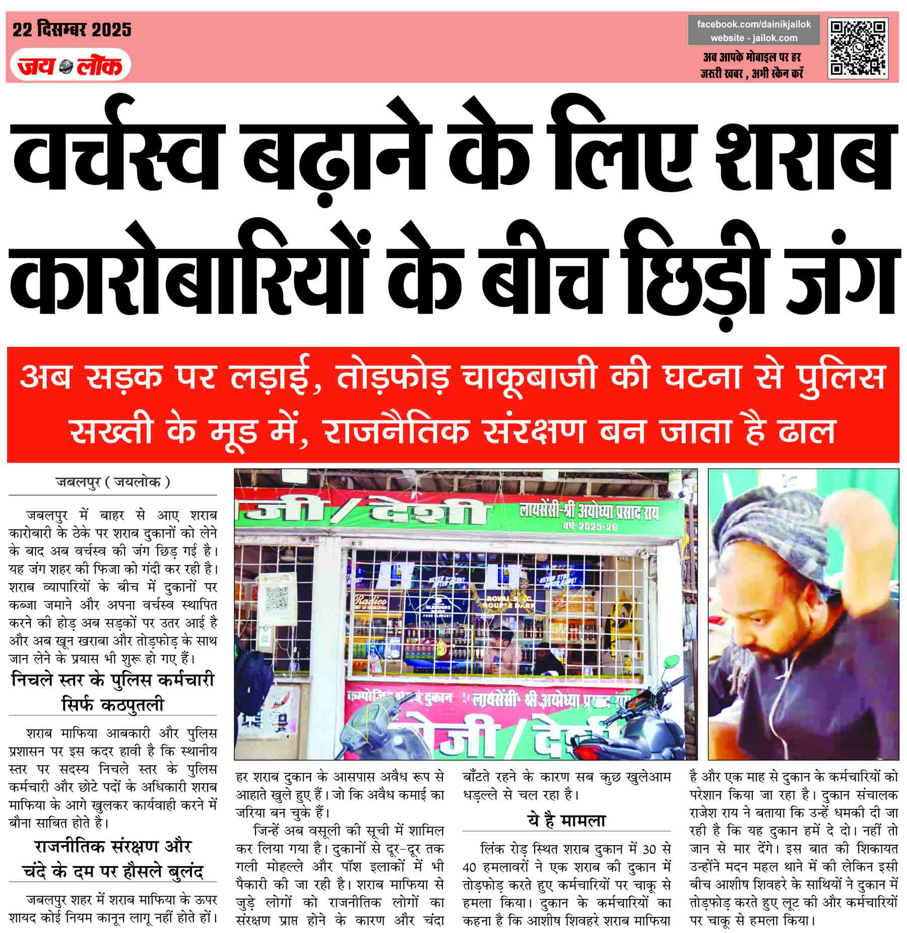 जबलपुर (जयलोक)। जबलपुर में बाहर से आए शराब कारोबारी के ठेके पर शराब दुकानों को लेने के बाद अब वर्चस्व की जंग छिड़ गई है। यह जंग शहर की फिजा को गंदी कर रही है। शराब व्यापारियों के बीच में दुकानों पर कब्जा जमाने और अपना वर्चस्व स्थापित करने की होड़ अब सडक़ों पर उतर … Continue reading शराब कारोबारियों के बीच छिड़ी जंग वर्चस्व बढ़ाने के लिए , अब सडक़ पर लड़ाई, तोडफ़ोड़ चाकूबाजी की घटना से पुलिस सख्ती के मूड में, राजनैतिक संरक्षण बन जाता है ढाल