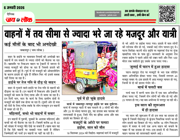 जबलपुर (जय लोक)। शहर के हाईवे पर यातायात नियमों की अनदेखी कर वाहनों में तय सवारी से ज्यादा लोगों को बैठाया जा रहा है। खासतौर पर पिकअप वाहन या टे्रक्टरों में जरूरत से ज्यादा मजदूरों को ढोया जा रहा है जिससे हादसे की आशंका बनी हुई है। पूर्व में भी मजदूरों की ओवरलोडिंग के कारण हादसे हो चुके हैं लेकिन फिर भी इससे सबक नहीं लिया जा रहा है।