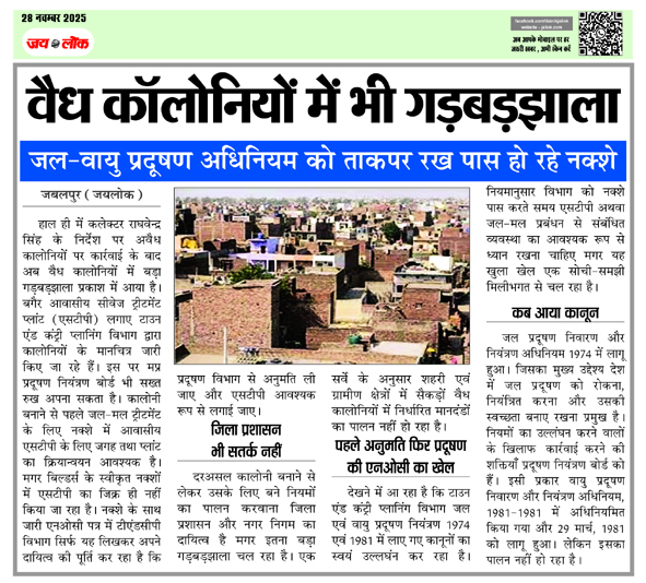 जबलपुर (जयलोक)। हाल ही में कलेक्टर राघवेन्द्र सिंह के निर्देश पर अवैध कालोनियों पर कार्रवाई के बाद अब वैध कालोनियों में बड़ा गड़बड़झाला प्रकाश में आया है। बगैर आवासीय सीवेज ट्रीटमेंट प्लांट (एसटीपी) लगाए टाउन एंड कंट्री प्लानिंग विभाग द्वारा कालोनियों के मानचित्र जारी किए जा रहे हैं। इस पर मप्र प्रदूषण नियंत्रण बोर्ड भी सख्त रुख अपना सकता है। कालोनी बनाने से पहले जल-मल ट्रीटमेंट के लिए नक्शे में आवासीय एसटीपी के लिए जगह तथा प्लांट का क्रियान्वयन आवश्यक है। मगर बिल्डर्स के स्वीकृत नक्शों में एसटीपी का जिक्र ही नहीं किया जा रहा है। नक्शे के साथ जारी एनओसी पत्र में टीएंडसीपी विभाग सिर्फ  यह लिखकर अपने दायित्व की पूर्ति कर रहा है कि प्रदूषण विभाग से अनुमति ली जाए और एसटीपी आवश्यक रूप से लगाई जाए।