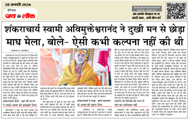 प्रयागराज (जयलोक)। प्रयागराज में चल रहे माघ मेला से शंकराचार्य स्वामी अविमुक्तेश्वरानंद ने दुखी मन से विदा लेने का ऐलान किया है। बुधवार सुबह आयोजित प्रेस कॉन्फ्रेंस में उन्होंने कहा कि वह आस्था और श्रद्धा के साथ माघ मेला में आए थे, लेकिन परिस्थितियां ऐसी बन गईं कि बिना स्नान किए ही लौटना पड़ रहा … Continue reading शंकराचार्य स्वामी अविमुक्तेश्वरानंद ने दुखी मन से छोड़ा माघ मेला, बोले- ऐसी कभी कल्पना नहीं की थी