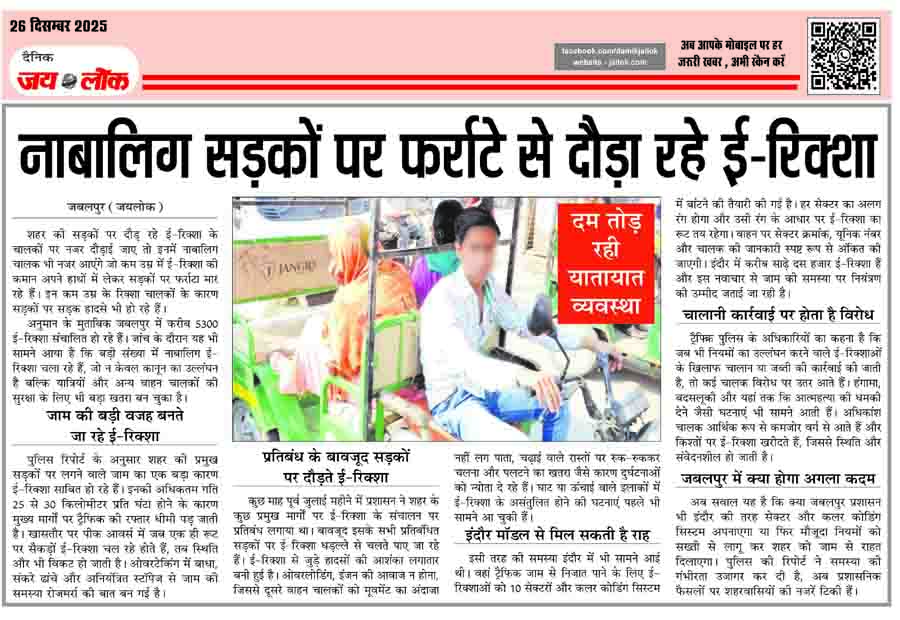अनुमान के मुताबिक जबलपुर में करीब 5300 ई-रिक्शा संचालित हो रहे हैं। जांच के दौरान यह भी सामने आया है कि बड़ी संख्या में नाबालिग ई-रिक्शा चला रहे हैं, जो न केवल कानून का उल्लंघन है बल्कि यात्रियों और अन्य वाहन चालकों की सुरक्षा के लिए भी बड़ा खतरा बन चुका है।
