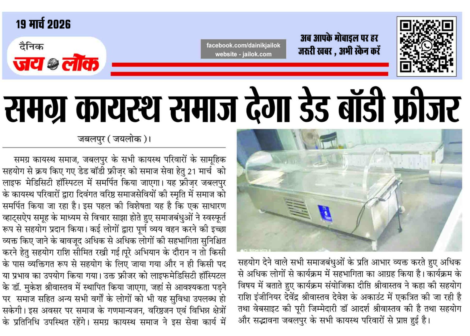 समग्र कायस्थ समाज देगा डेड बॉडी फ्रीजर