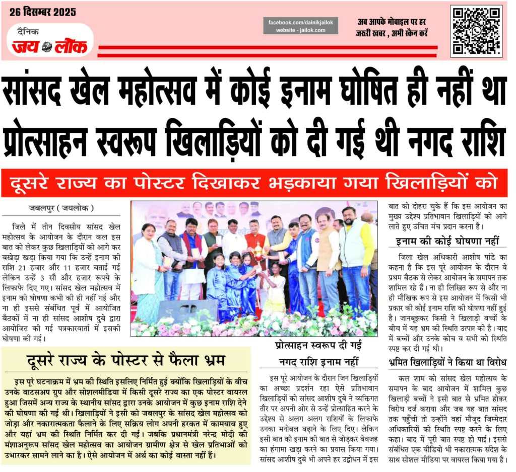 जबलपुर (जयलोक)। जिले में तीन दिवसीय सांसद खेल महोत्सव के आयोजन के दौरान कल इस बात को लेकर कुछ खिलाड़ियों को आगे कर बखेड़ा खड़ा किया गया कि उन्हें इनाम की राशि 21 हजार और 11 हजार बताई गई लेकिन उन्हें 3 सौ और हजार रूपये के लिफाफे दिए गए। सांसद खेल महोत्सव में इनाम … Continue reading सांसद खेल महोत्सव में कोई इनाम घोषित ही नहीं था प्रोत्साहन स्वरूप खिलाड़ियों को दी गई थी नगद राशि दूसरे राज्य का पोस्टर दिखाकर भड़काया गया खिलाड़ियों को