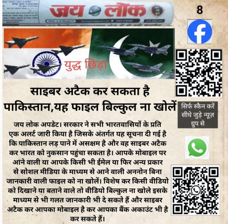 जय लोक अपडेट। सरकार ने सभी भारतवासियों के प्रति एक अलर्ट जारी किया है जिसके अंतर्गत यह सूचना दी गई है कि पाकिस्तान लड़ पाने में असक्षम है और वह साइबर अटैक कर भारत को नुकसान पहुंचा सकता है। आपके मोबाइल पर आने वाली या आपके किसी भी ईमेल या फिर अन्य प्रकार से सोशल … Continue reading साइबर अटैक कर सकता है पाकिस्तान,यह फाइल बिल्कुल ना खोलें