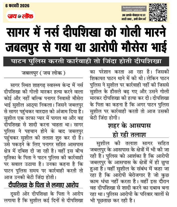 जबलपुर (जय लोक)। सागर स्थित शाहगढ़ स्वास्थ्य केन्द्र में नर्स दीपशिखा की गोली मारकर हत्या करने वाला कोई और नहीं बल्कि पनागर निवासी मौसेरा भाई सुशील आठ्या निकला। जिसने जबलपुर से सागर पहुंचकर वारदात को अंजाम दिया है। सुशील एक तरफा प्यार में पागल था और वह दीपशिखा से शादी करना चाहता था। सागर पुलिस … Continue reading सागर में नर्स दीपशिखा को गोली मारने जबलपुर से गया था आरोपी मौसेरा भाई, पाटन पुलिस करती कार्रवाही तो जिंदा होती दीपशिखा
