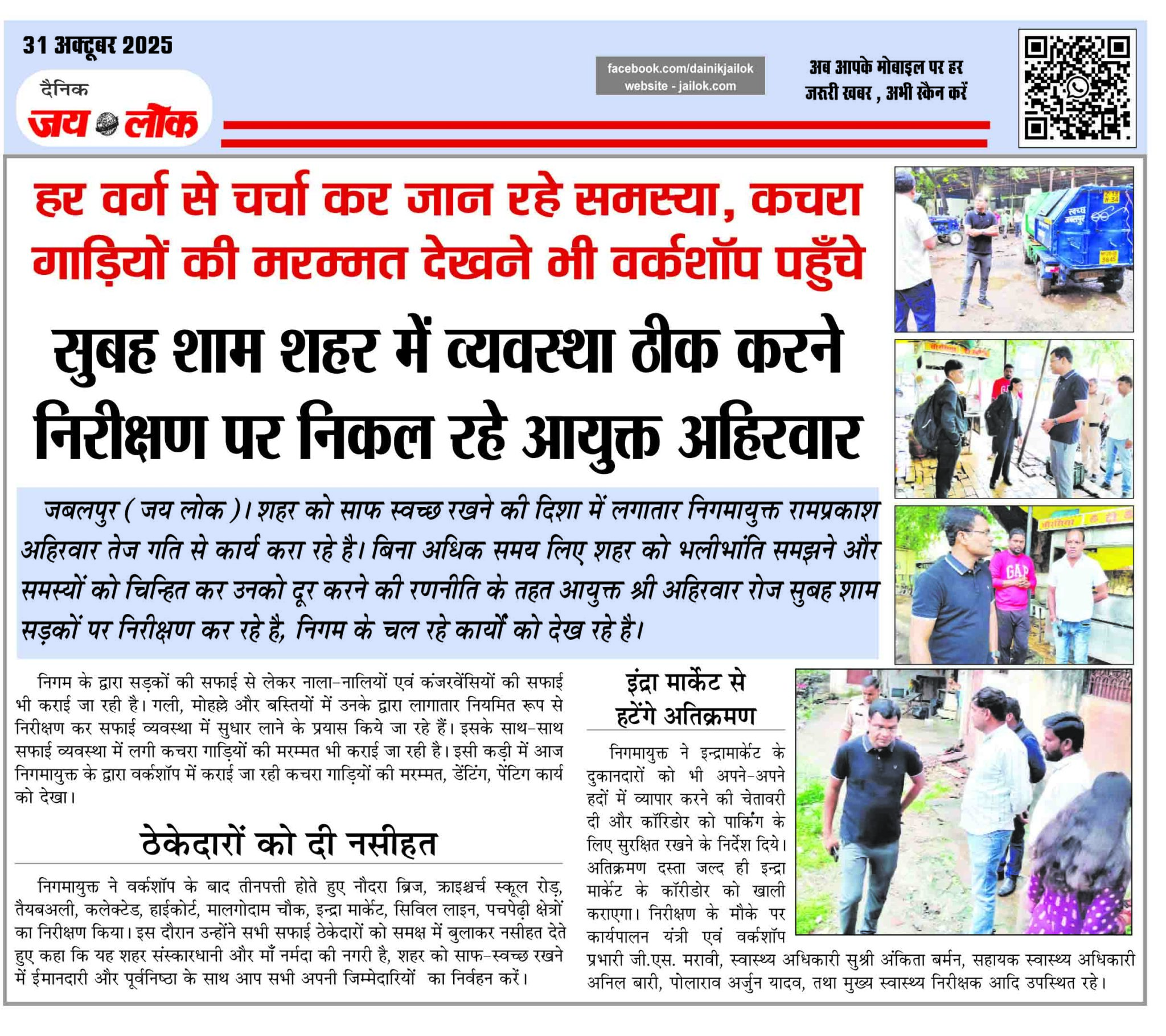जबलपुर जय लोक। शहर को साफ स्वच्छ रखने की दिशा में लगातार निगमायुक्त रामप्रकाश अहिरवार तेज गति से कार्य करा रहे है। बिना अधिक समय लिए शहर को भलीभांति समझने और समस्यों को चिन्हित कर उनको दूर करने की रणनीति के तहत आयुक्त श्री अहिरवार रोज सुबह शाम सडक़ों पर निरीक्षण कर रहे है, निगम … Continue reading सुबह शाम शहर में व्यवस्था ठीक करने निरीक्षण पर निकल रहे आयुक्त अहिरवार, हर वर्ग से चर्चा कर जान रहे समस्या, कचरा गाडिय़ों की मरम्मत देखने भी वर्कशॉप पहुॅंचे