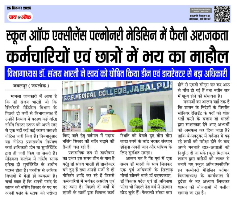 विभागाध्यक्ष डॉ. संजय भारती ने स्वयं को घोषित किया डीन एवं डायरेक्टर से बड़ा अधिकारी जबलपुर (जयलोक)। मामला जानकारी में आया है कि डॉ संजय भारती जो कि रेस्पिरेटरी मेडिसिन विभाग के पिछले दो वर्षों से विभागाध्यक्ष हैं उन्होंने विभाग में पदस्थ कई वरिष्ठ नर्सिंग सिस्टर स्टाफ को अपने स्तर से एक नहीं कई कई … Continue reading स्कूल आफ एक्सीलेंस पल्मोनरी मेडिसिन में फैली अराजकता कर्मचारियों एवं छात्रों में भय का माहौल