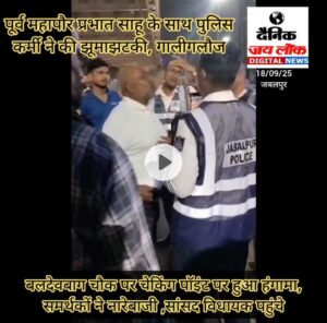 सैकड़ों समर्थक पहुंचे जमकर हुआ प्रदर्शन, भीड़ ने दो पुलिस वालों से की झूमाझटकी सांसद – विधायक भी मौके पर पहुंचे जबलपुर जय लोक अपडेट। आज रात करीब 8:00 बजे के दरमियान नगर के पूर्व महापौर पूर्व भाजपा के नगर अध्यक्ष वरिष्ठ भाजपा नेता प्रभात साहू दो पहिया वाहन पर बलदेव बाग से रानीताल की … Continue reading हद कर दी : पूर्व महापौर प्रभात साहू से चेकिंग के दौरान गालीगलौज झूमा झटकी, घटना का वीडियो