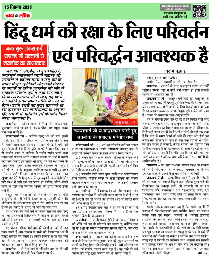 जगतगुरू शंकराचार्य सदानंद जी सरस्वती से जयलोक का साक्षात्कार कैप्शन :-शंकराचार्य जी से साक्षात्कार करते हुए जयलोक के संपादक परितोष वर्मा जबलपुर (जयलोक)। द्वारकापीठ के जगतगुरू शंकराचार्य स्वामी सदानंद जी सरस्वती से वर्तमान समय में हिंदू धर्म के सामने मौजूद चुनौतियाँ और उनसे निपटने के उपायों पर दैनिक जयलोक की ओर से संपादक परितोष वर्मा … Continue reading हिंदू धर्म की रक्षा के लिए परिवर्तन एवं परिवद्र्धन आवश्यक है