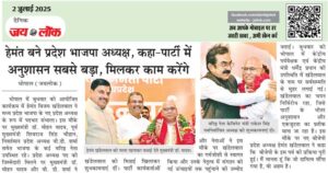 भोपाल (जयलोक)। भोपाल में बुधवार को आयोजित कार्यक्रम में हेमंत विजय खंडेलवाल ने मध्य प्रदेश भाजपा के नए प्रदेश अध्यक्ष के रूप में पदभार संभाला। इस मौके पर मुख्यमंत्री डॉ. मोहन यादव, पूर्व मुख्यमंत्री शिवराज सिंह चौहान, निवर्तमान प्रदेश अध्यक्ष वी.डी. शर्मा समेत भाजपा के कई वरिष्ठ नेता उपस्थित रहे। प्रदेश अध्यक्ष पद की जिम्मेदारी … Continue reading हेमंत बने प्रदेश भाजपा अध्यक्ष, कहा-पार्टी में अनुशासन सबसे बड़ा, मिलकर काम करेंगे