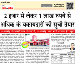 जबलपुर (जयलोक)। नगर निगम प्रशासन ने शहर में दर्ज आवासीय व्यावसायिक और अन्य प्रकार की संपत्तियों की पूरी सूची तैयार की है। इस सूची में उन लोगों को भी शामिल किया गया है जिनके ऊपर 2 हजार रुपयों से लेकर 1 लाख रुपये तक या उससे अधिक की कर की राशि बकाया है। नगर निगम … Continue reading 2 हजार से लेकर 1 लाख रुपये से अधिक के बकायदारों की सूची तैयार, 65 करोड़ के सम्पत्तिकर के बाकी, 65 करोड़ अन्य मदों से होना है वसूल