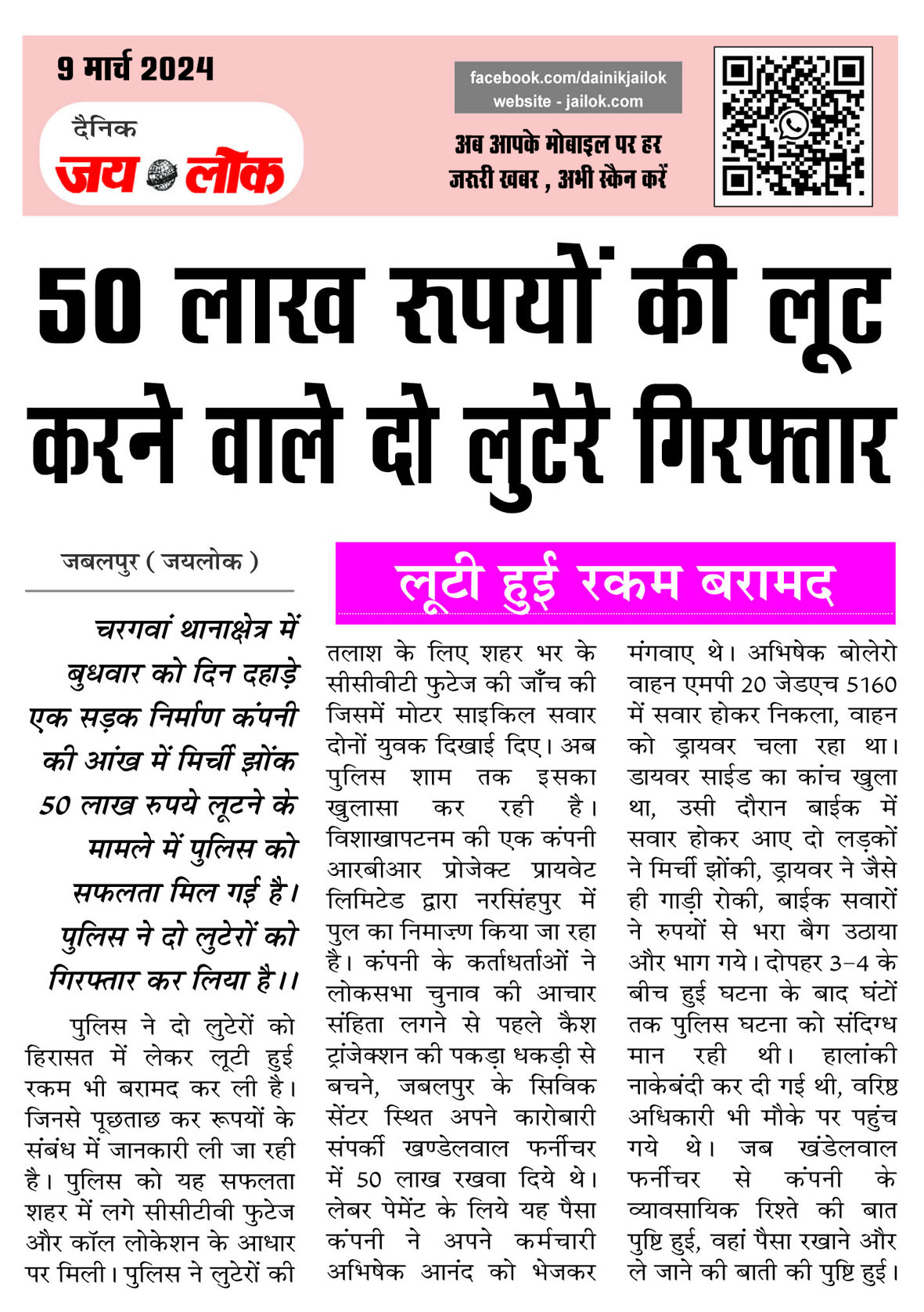 50 लाख रूपयों की लूट करने वाले दो लुटेरे गिरफ्तार