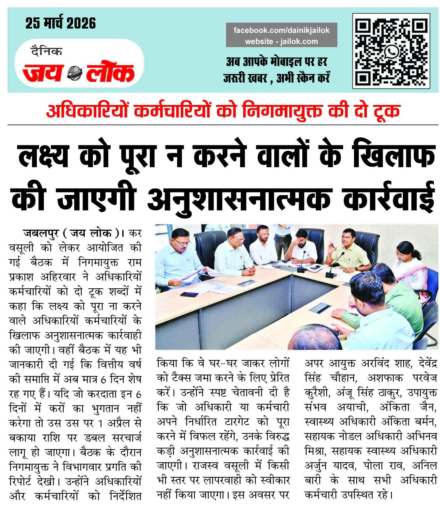 जबलपुर (जय लोक)। कर वसूली को लेकर आयोजित की गई बैठक में निगमायुक्त राम प्रकाश अहिरवार ने अधिकारियों कर्मचारियों को